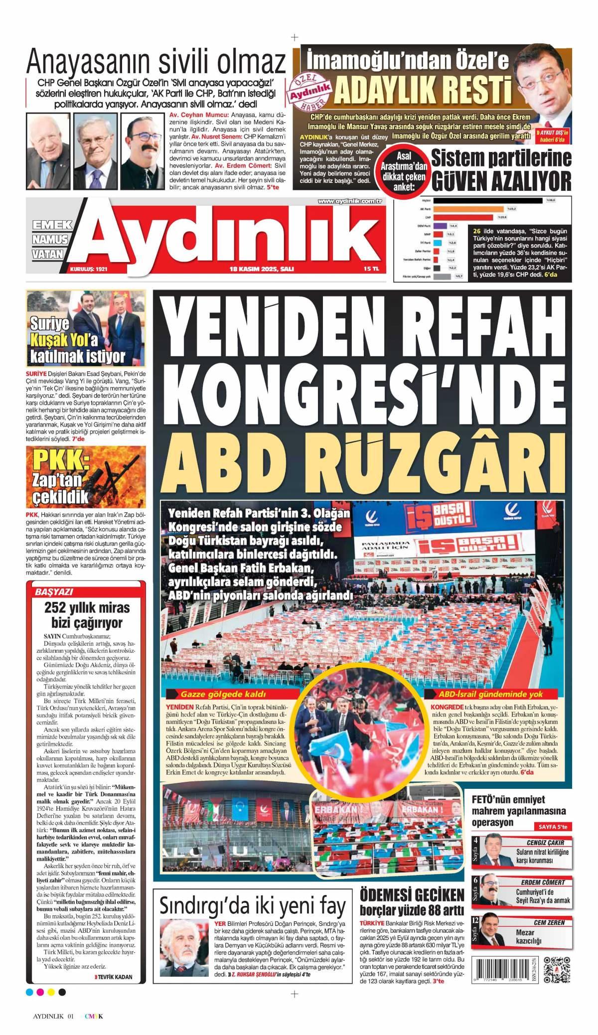 Aydınlık Gazetesi 19 Kasım 2025 Günü Manşeti