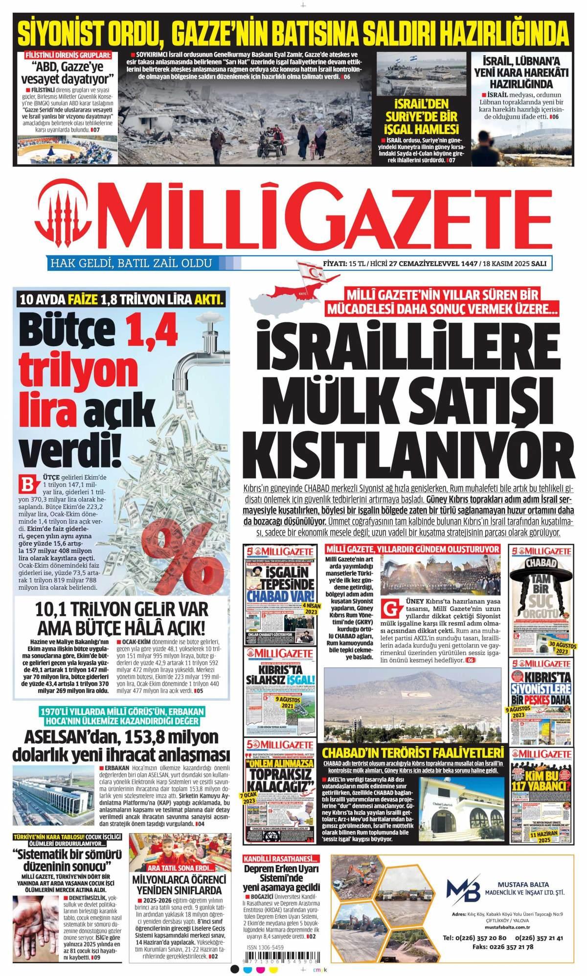 Milli Gazetesi 19 Kasım 2025 Günü Manşeti