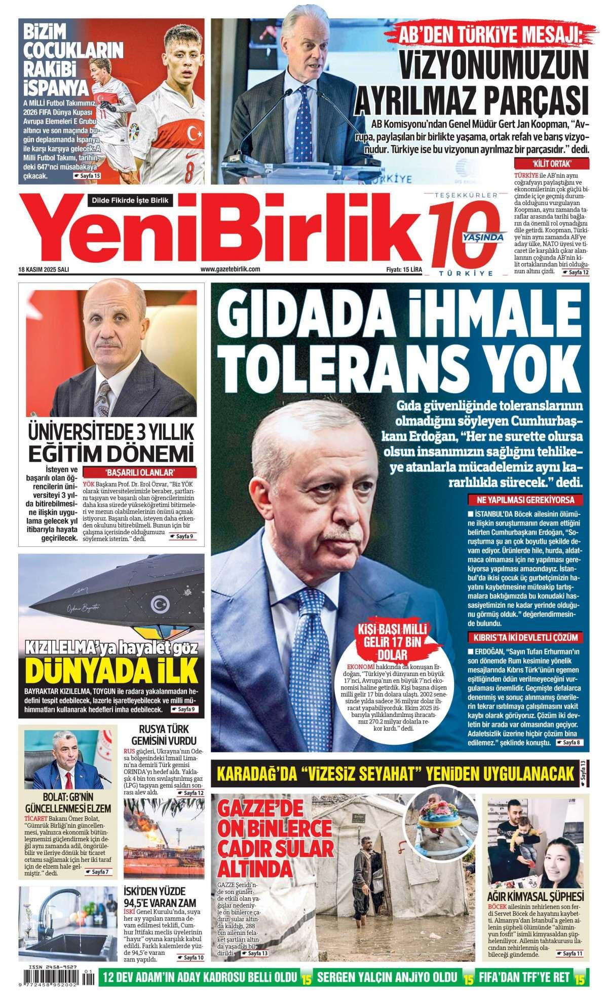 Yeni Birlik Gazetesi 19 Kasım 2025 Günü Manşeti