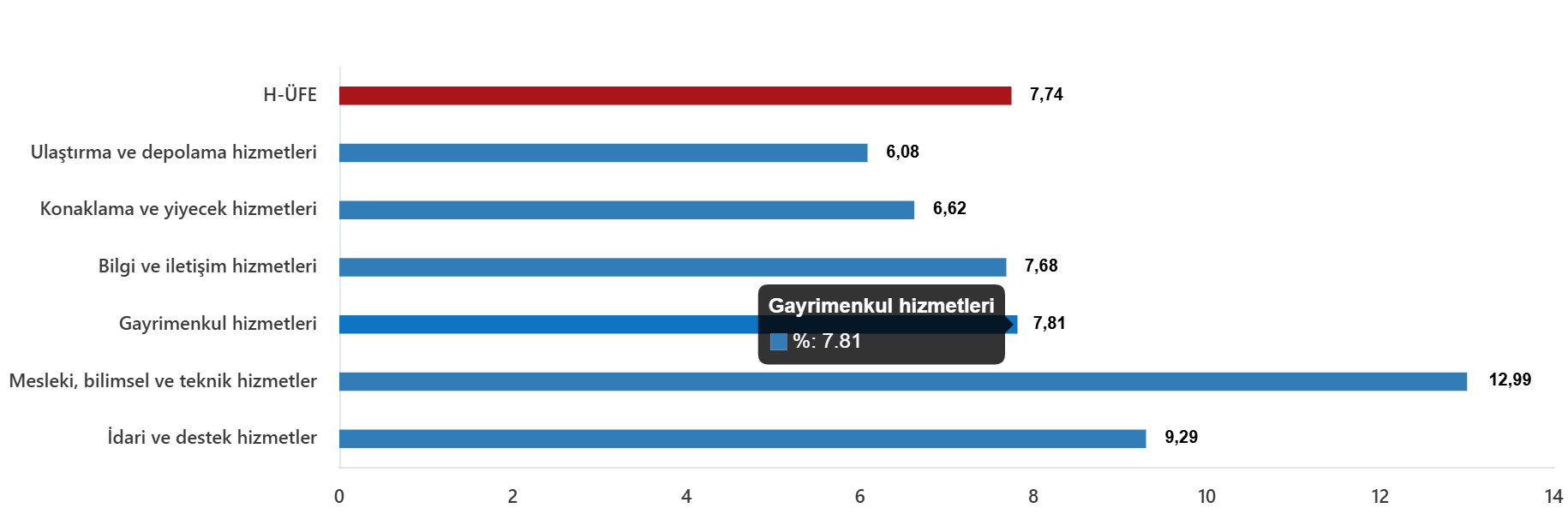 Bir önceki yılın aynı ayına göre, ulaştırma ve depolama hizmetlerinde %32,73 artış, konaklama ve yiyecek hizmetlerinde %33,85 artış, bilgi ve iletişim hizmetlerinde %35,06 artış, gayrimenkul hizmetlerinde %41,94 artış, mesleki, bilimsel ve teknik hizmetlerde %37,06 artış, idari ve destek hizmetlerde %32,07 artış gerçekleşti.
