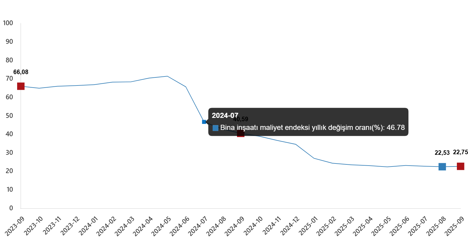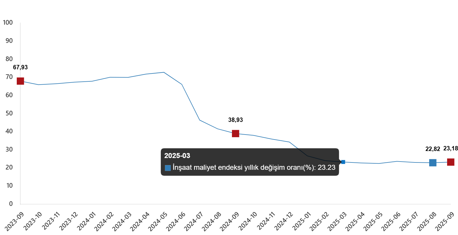 İnşaat maliyet endeksi, 2025 yılı Eylül ayında bir önceki aya göre %0,87 arttı, bir önceki yılın aynı ayına göre %23,18 arttı. Bir önceki aya göre malzeme endeksi %0,90 arttı, işçilik endeksi %0,82 arttı. Ayrıca bir önceki yılın aynı ayına göre malzeme endeksi %19,32 arttı, işçilik endeksi %30,99 arttı.