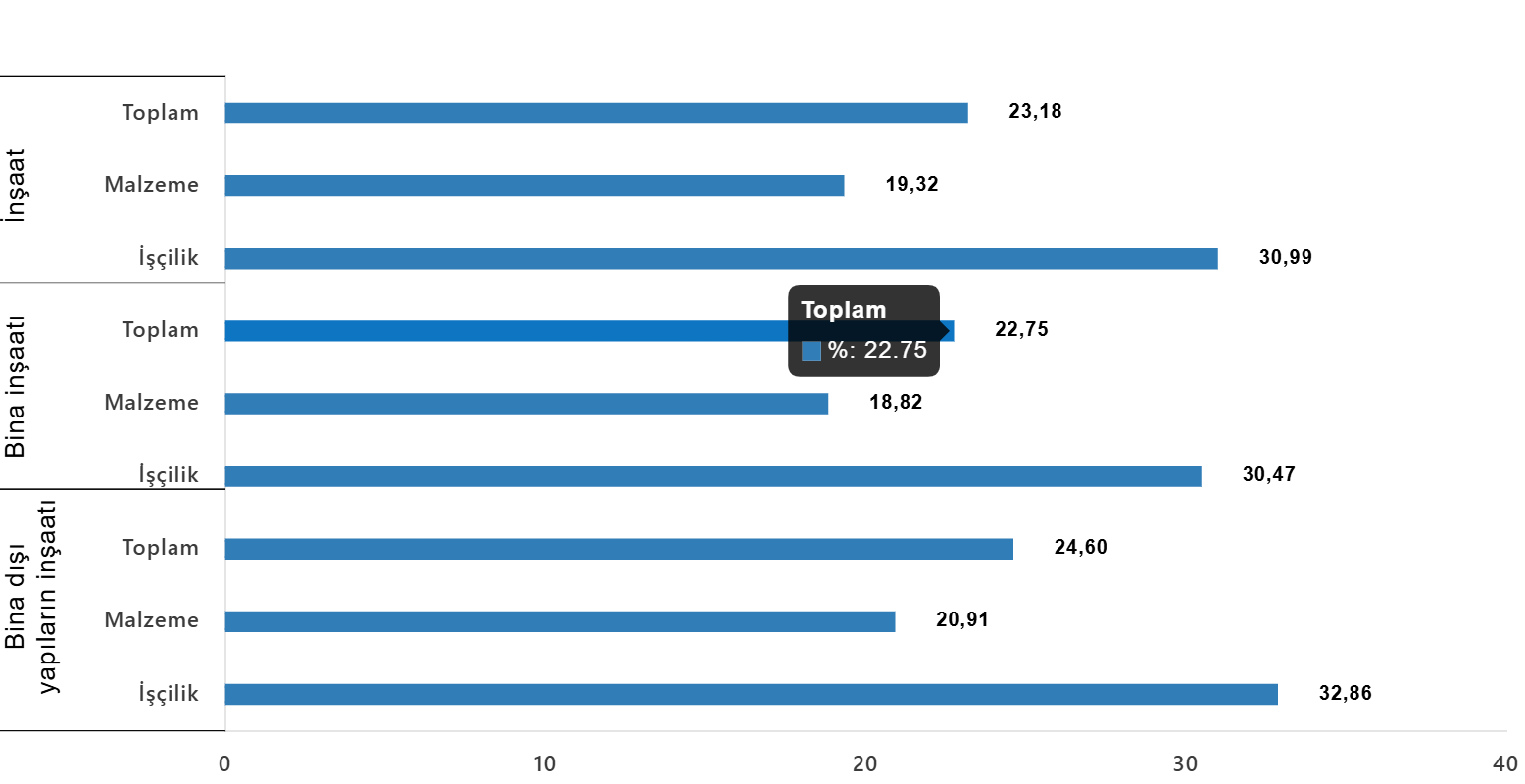 Bina inşaatı maliyet endeksi, bir önceki aya göre %0,96 arttı, bir önceki yılın aynı ayına göre %22,75 arttı. Bir önceki aya göre malzeme endeksi %1,06 arttı, işçilik endeksi %0,80 arttı. Ayrıca bir önceki yılın aynı ayına göre malzeme endeksi %18,82 arttı, işçilik endeksi %30,47 arttı.