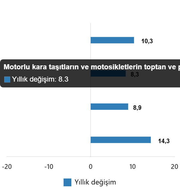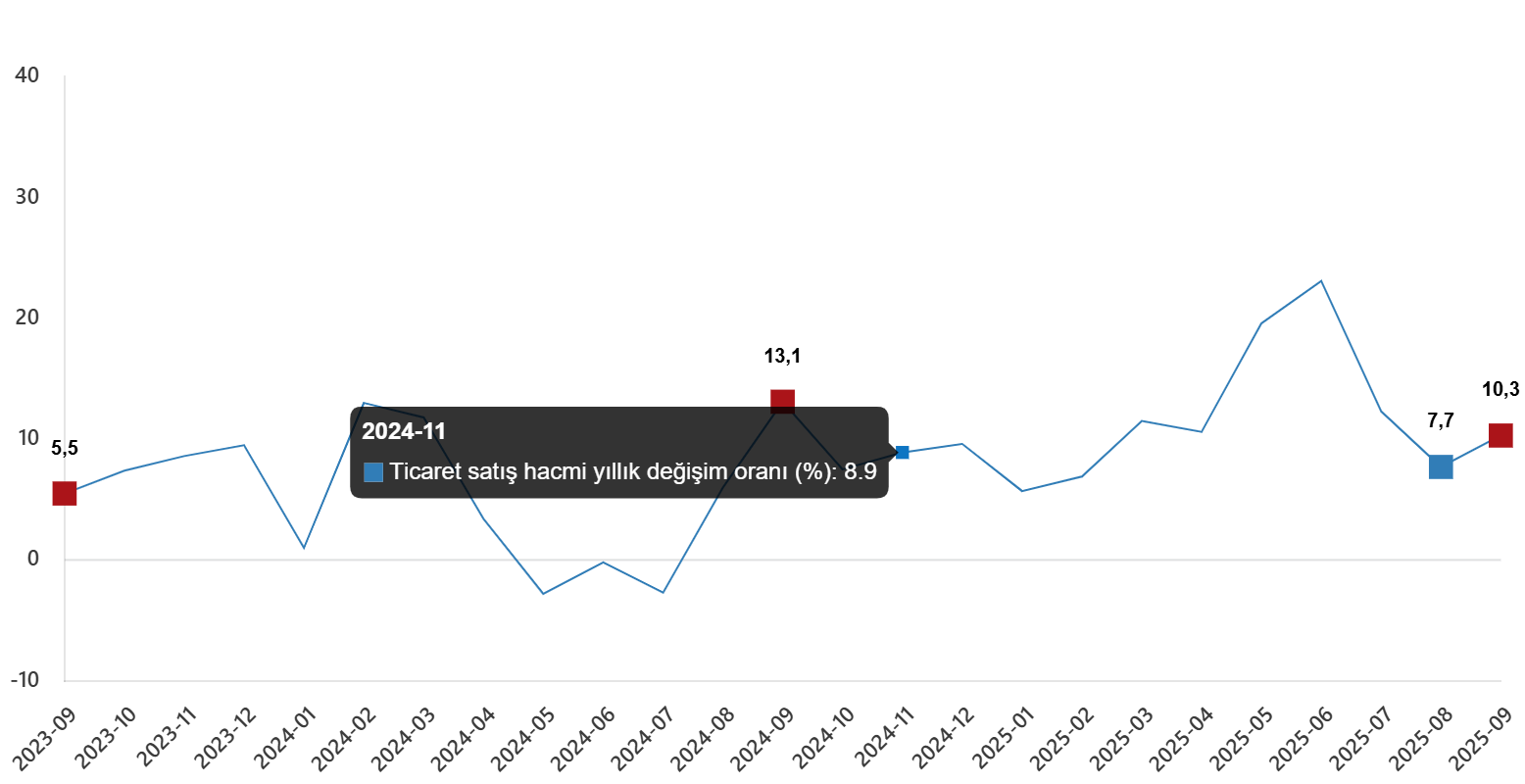 Ticaret satış hacmi (2021=100) 2025 yılı Eylül ayında bir önceki yılın aynı ayına göre %10,3 arttı. Aynı ayda motorlu kara taşıtlarının ve motosikletlerin toptan ve perakende ticareti ile onarımı için satış hacmi %8,3 arttı, toptan ticaret satış hacmi %8,9 arttı, perakende ticaret satış hacmi ise %14,3 arttı.